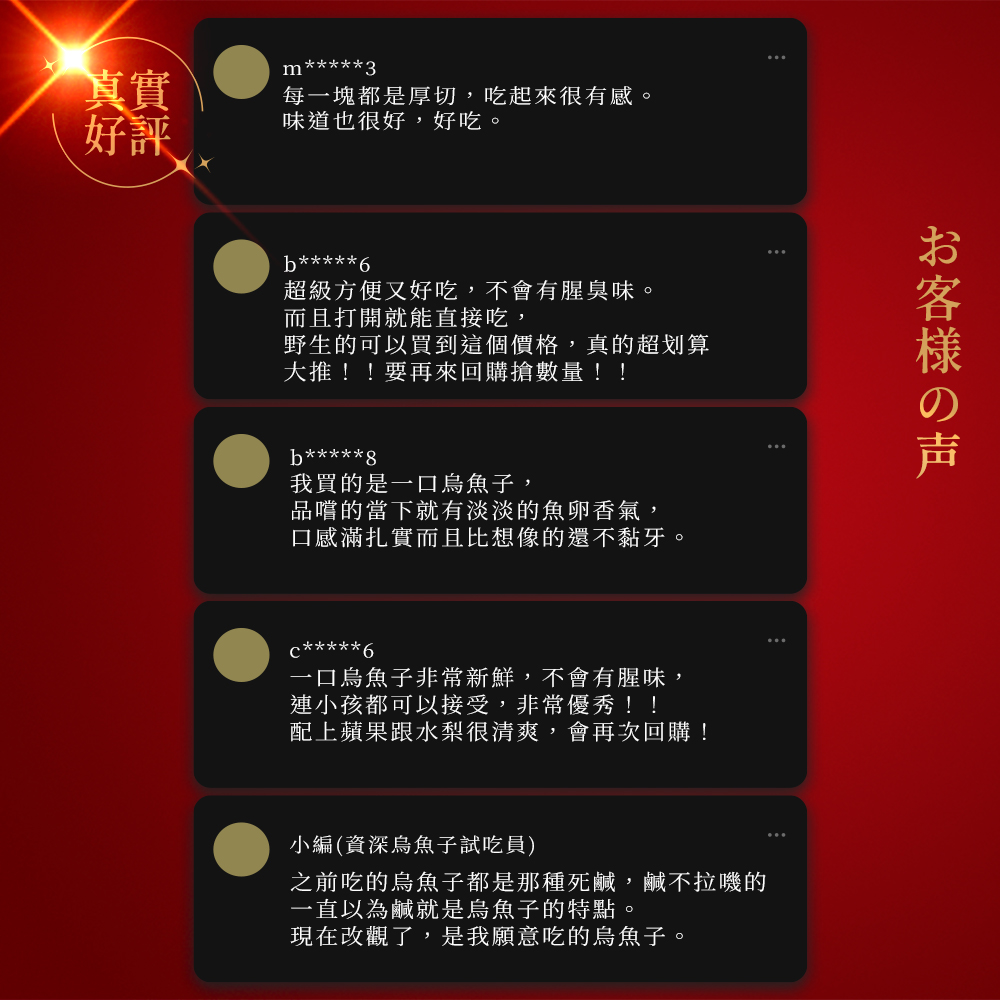 ✔使用新鮮A級5兩野生烏魚子製成,油脂豐富香氣濃郁