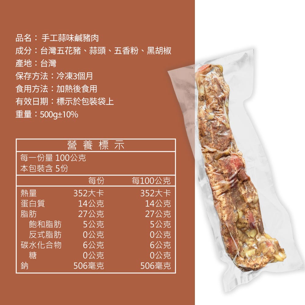 成分:台灣五花豬、蒜頭、五香粉、黑胡椒