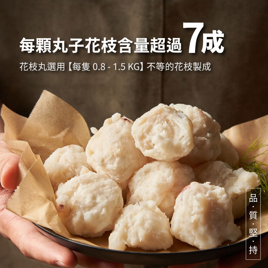 成分:花枝、磷酸二澱粉、旗魚漿、豬背脂油、食鹽、L-麩酸鈉、品質改良劑(多磷酸鈉、焦磷酸鈉)、甜味劑(蔗糖素)