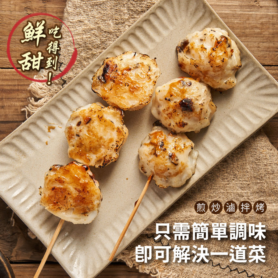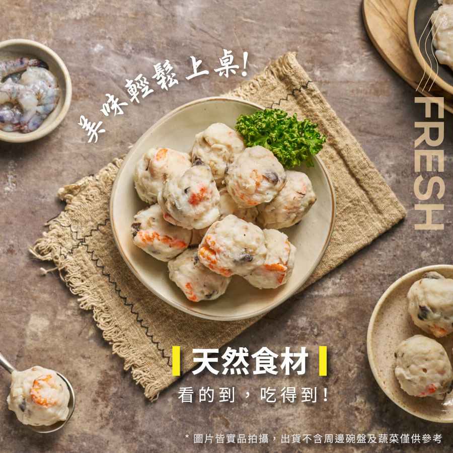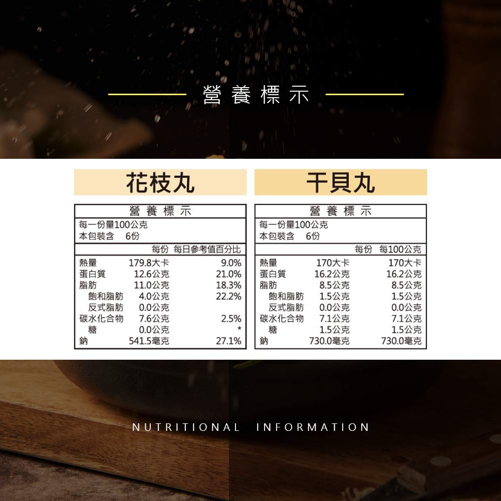 成分:花枝、干貝、磷酸二澱粉、旗魚漿、香菇、豬背脂油、食鹽、L-麩酸鈉、品質改良劑(多磷酸鈉、焦磷酸鈉)、甜味劑(蔗糖素)